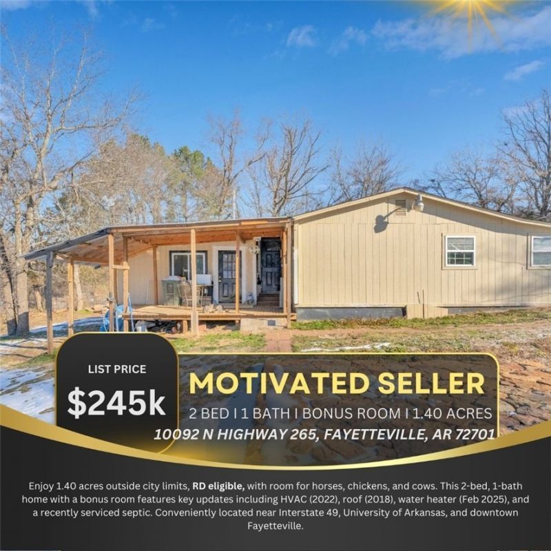 Country living close to town! 1.40 acres, RD eligible, outside city limits. Bring your horses, chickens, and cows.Enjoy peaceful living on 1.40 acres just outside Fayetteville city limits. This property features a 2-bedroom, 1-bath home with a bonus room and plenty of space for animals. Major updates include HVAC (2022), roof (2018), water heater replaced Feb 2025, and recently serviced septic. Conveniently located minutes from I-49, the University of Arkansas, and downtown Fayetteville.