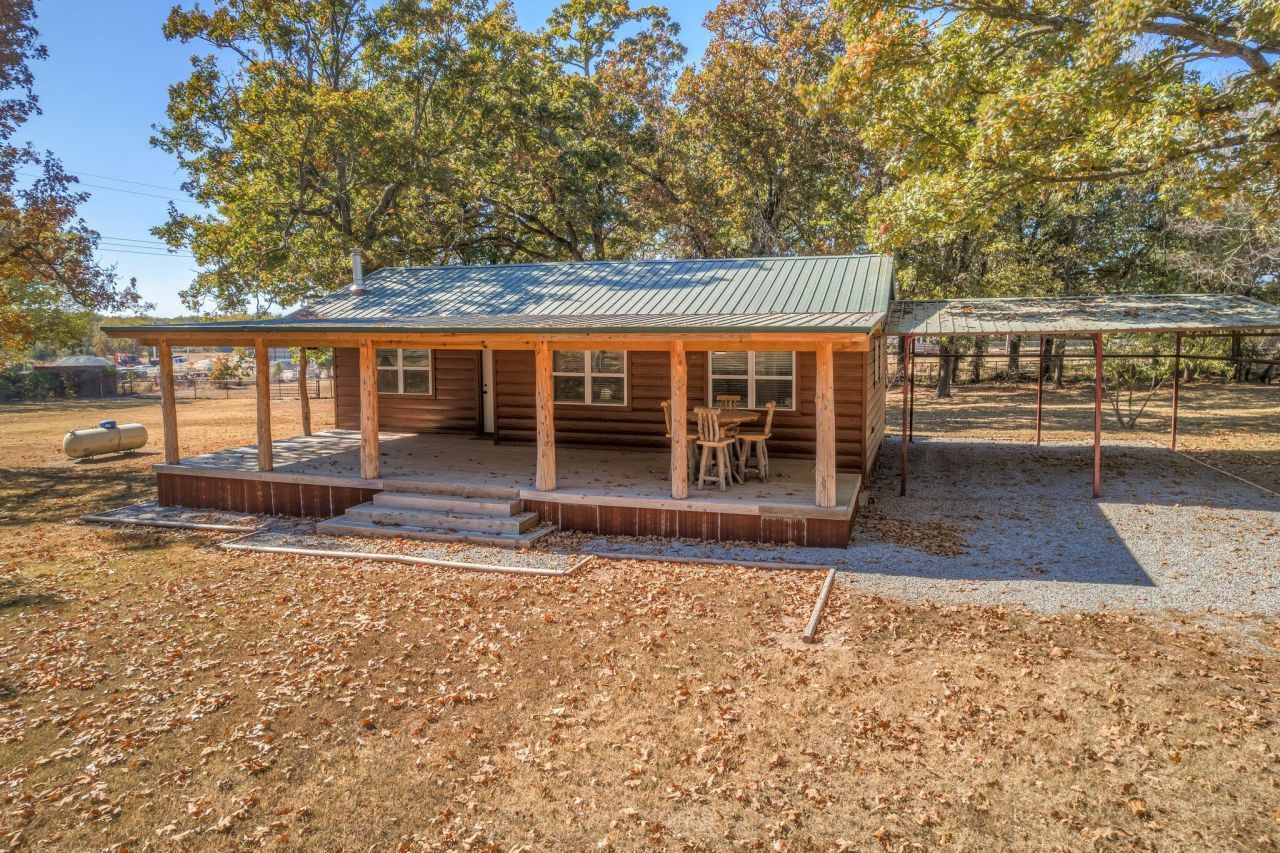 Nestled on 2.5 serene acres with mature trees, this charming home features rustic faux log siding, a spacious front porch with local wood posts, and excellent VRBO/Airbnb potential. Inside, enjoy shiplap walls, brand-new kitchen cabinets, stone countertops, modern appliances, and tile flooring. Both bathrooms are fully renovated with heated floors. Two bedrooms include walk-in closets, and the laundry room leads to a large covered back porch. Also included: producing fruit trees, a storage shed, and a barn. Close to Grand Lake, Eucha Lake, Grove, and Jay schools. A perfect retreat or income property!