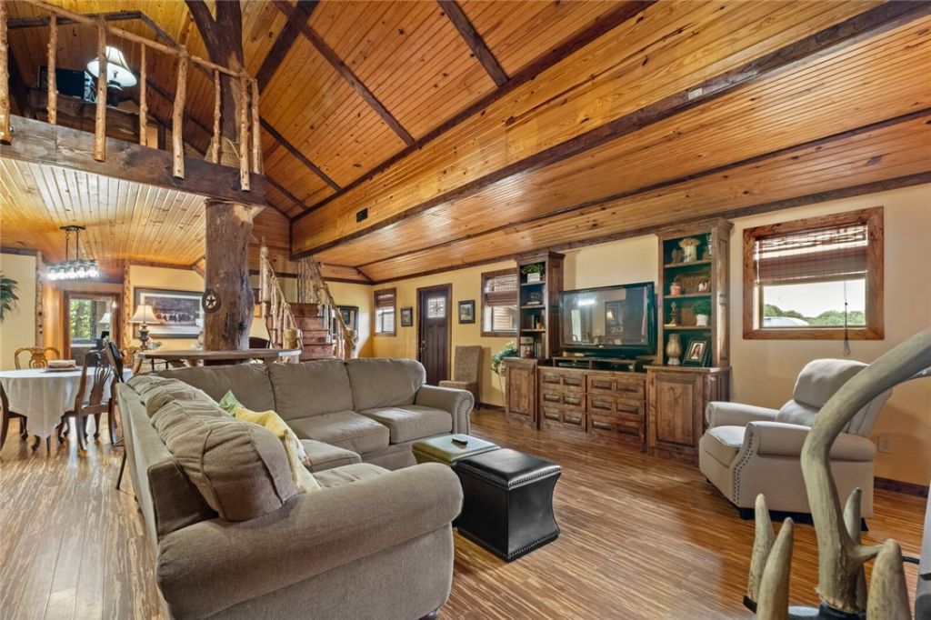 Beautiful cabin living on 5 acres +/- in country setting not far from town! This home features a rustic charm starting when you walk through the door! Chef's kitchen with dark stained wood cabinets, granite countertops, island with step up bar seating, open concept to the living room that features stone hearth that extends to ceiling behind the freestanding wood stove. Cathedral ceilings in living room opening into the loft area (currently used as home office space) that looks over living & kitchen. Upstairs features bedroom #3 closed off from loft area. Downstairs includes main and 2nd bedrooms along with en-suite main bathroom with custom features of built-in soaking tub, walk-in shower with rock surround, and large walk-in closet. Detached 30x60 shop includes two garage doors, insulated walls w/osb, and plenty of space for projects or storage! New well pump. 6 minute drive to downtown Pea Ridge.