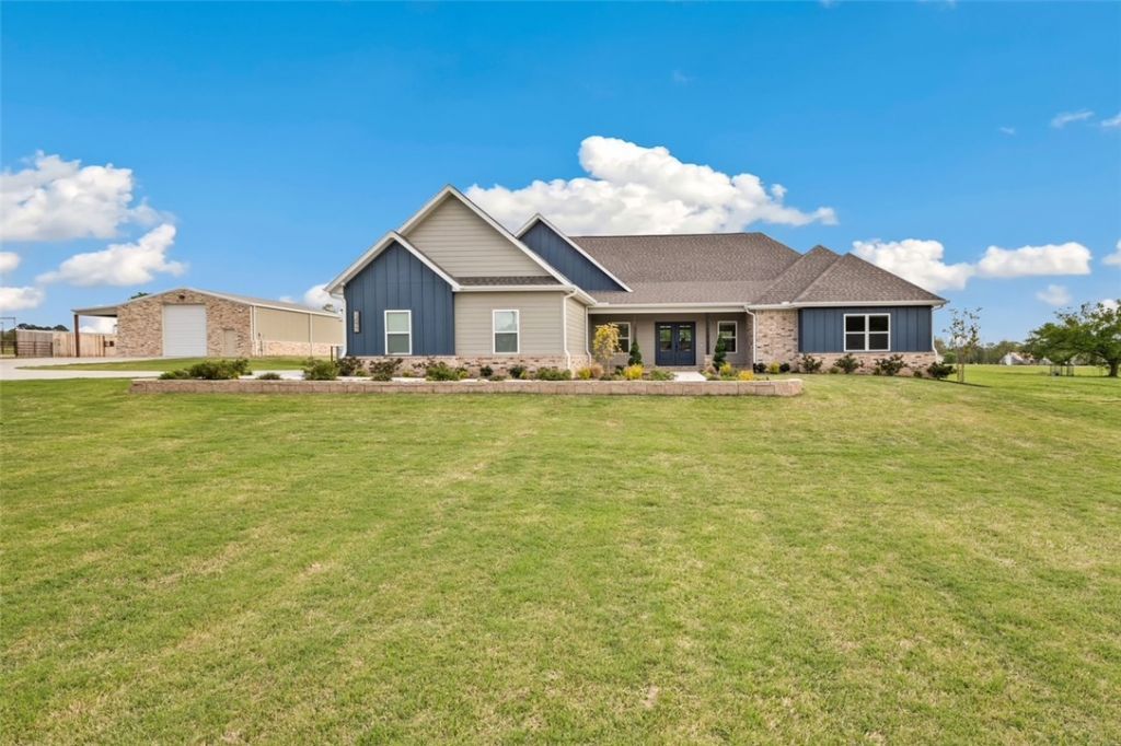 Stunning 1YO custom home featuring 3BR/2BA - 2,930 SF, situated on 10.68 AC m/l of gorgeous countryside. This beautifully designed property offers high-end amenities throughout, incl top-of-the-line appliances, premium fixtures, & upscale flooring to showcase exceptional quality & style. The spacious floor plan is complemented by a large laundry area & a 3-car garage. Step outside to a beautifully landscaped yard w/a full sprinkler system, creating a lush, outdoor setting. Sturdy pipe-fenced pastures w/cross fencing provide excellent functionality for livestock, horses, or rotational grazing. You'll also find an impressive 36x80 insulated shop/barn w/concrete floors & infrared heat. Equestrian enthusiasts will love the two gorgeous horse barns complete w/2-stalls, a tankless HWH & a wash area, making this property ideal for horses. A rare opportunity to own a nearly new home w/luxury features, functional outbuildings, & breathtaking acreage. This is truly a must-see property to fully appreciate all it has to offer!