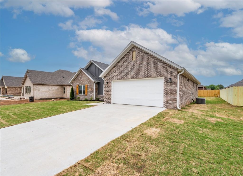 Beautiful new construction with great curb appeal and a functional layout. Spacious living room features tray ceiling detail, abundant natural light, and a cozy fireplace. The kitchen offers white cabinetry with soft-close doors and drawers, quartz countertops, tile backsplash, stainless steel appliances, gas range, under-cabinet lighting, and ample workspace for cooking and entertaining. Private primary suite includes double vanities, walk-in tiled shower, and generous storage. Laundry room features built-in cabinetry for added convenience. LVP flooring throughout entire home. Fence, blinds, and gutters included. Energy-efficient construction, neutral color palette, and quality craftsmanship throughout. Located just on the edge of town - approx 5 minutes to I49 and 10 minutes to UARK.