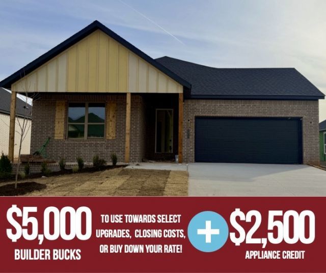 Discover Yorktown Subdivision in Pea Ridge ? where classic design meets modern living.Welcome to the Cardinal plan, this open-concept layout seamlessly connects the living, kitchen, and dining areas, featuring durable LVP flooring throughout the main living spaces.Enjoy thoughtful upgrades like fully insulated garage doors and walls for enhanced energy efficiency and year-round comfort, plus a striking 8-foot front door that creates an impressive entry and fills the home with natural light.The kitchen and living areas are perfect for entertaining, while the private spaces shine with carpeted bedrooms, tiled bathrooms, and a tiled utility room. The primary bedroom is a true retreat, highlighted by elegant ceiling beams that add warmth and character. For a limited time, Lower your interest rate with $5,000 from the builder + $2,500 appliance allowance + up to 4k in closing costs from select lenders. For a total of up to 11,500K with lender incentives. Fence, blinds, and gutters are all included.