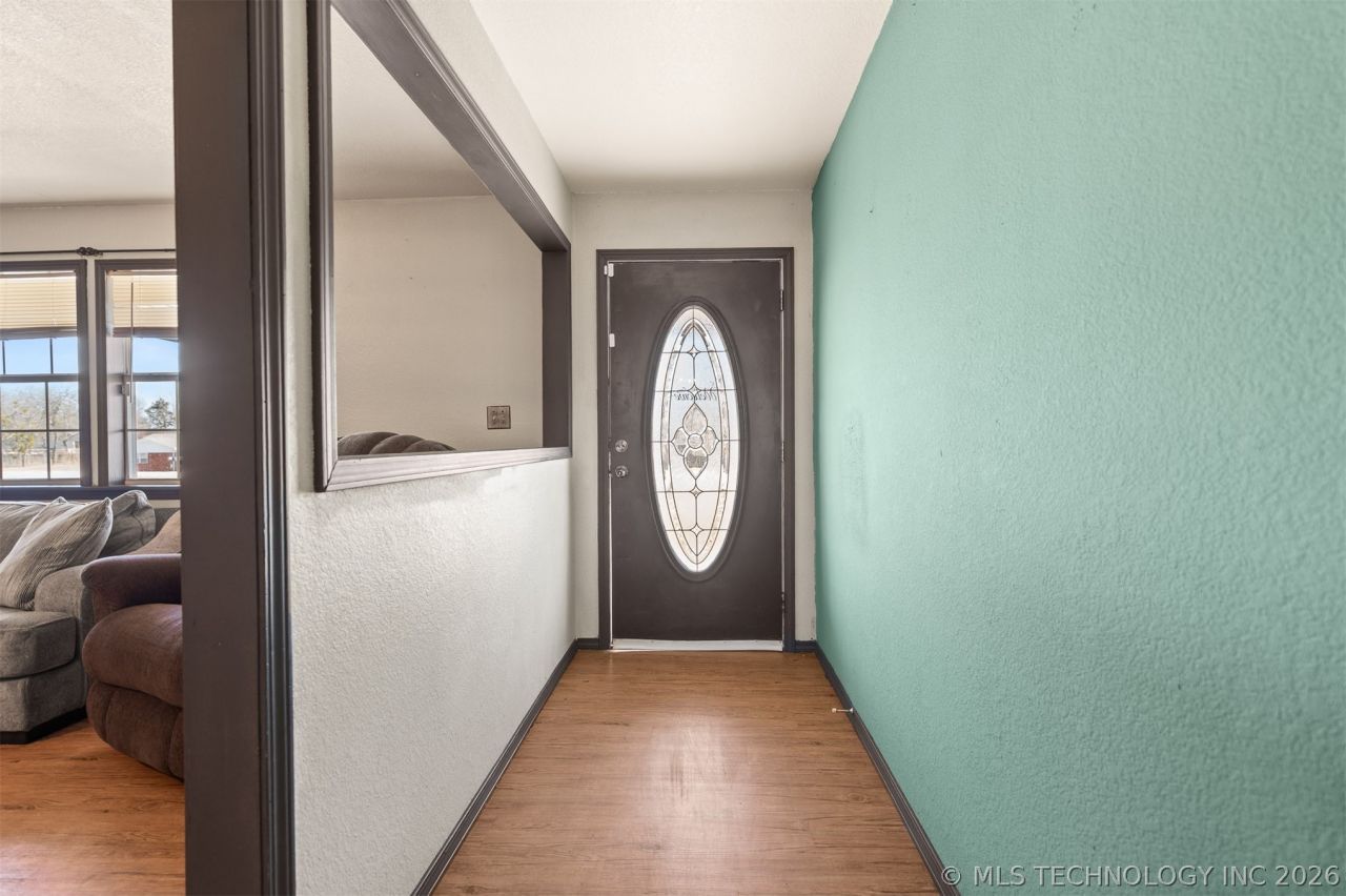 Located on approximately 1.1 acres, this 3-bedroom, 2-bathroom home offers a practical layout with room to spread out. The large living room opens directly to the kitchen and dining area, creating an easy flow for daily living and gatherings. The kitchen includes an island, extensive cabinet space, and plenty of countertop area for meal prep and storage. A wide hallway connects the bedrooms and includes a washer and dryer area for convenience. The bedrooms feature large closets, along with additional storage throughout the home. The primary bedroom includes a walk-in closet and private bath with double sinks and a tub/shower combination. The hall bath also offers a tub/shower combo. Exterior features include a covered back patio, storm cellar, two storage buildings, a shop building, and a carport. The acreage and outbuildings provide flexibility for a variety of uses.
