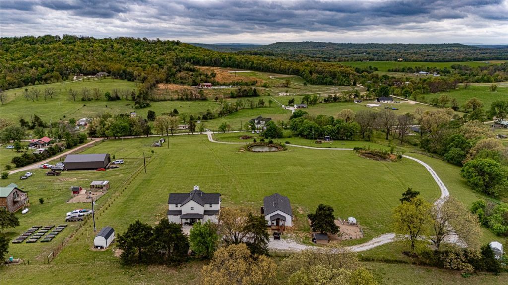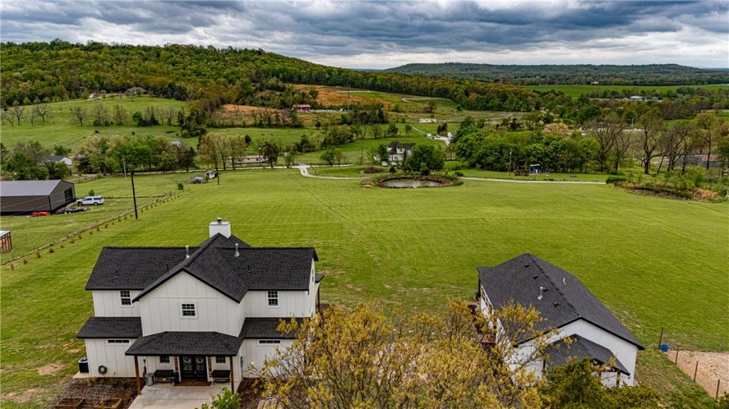 This 8.93 Acre +/- property features a Main home & Guest Home built in 2023! With 1921 Sqft in the main home, head inside from the covered front porch to open concept living w/ wood-burning stove, tons of natural light & wood-look tile throughout. Light & bright kitchen w/ quartz counters, white cabinetry w/ soft close hinges, SS Apps, large center island & walk-in pantry. Rejuvenate in the primary bedrm w/ private ensuite feat: double sink vanity, walk-in shower & dual walk-in closets! Split floor plan w/ upstairs feat: 2nd living w/ built-ins, 2 add'tl bedrms & full bathrm! 912 SqFt Guest Home is open concept w/ 10' ceilings, natural light, & wood-look tile throughout feat: living rm, full kitchen, laundry rm, 1 Bedrm w/ walk-in closet & 1 full bathrm! Both homes feature covered back patios overlooking the gorgeous property & Arkansas's rolling hills! 8.93 Ac +/- gently rolling w/ 2 ponds perfect for nature enthusiasts or hobby farmers! PLUS 2 storage bldgs & main house is prewired for hot tub. Don't miss out!