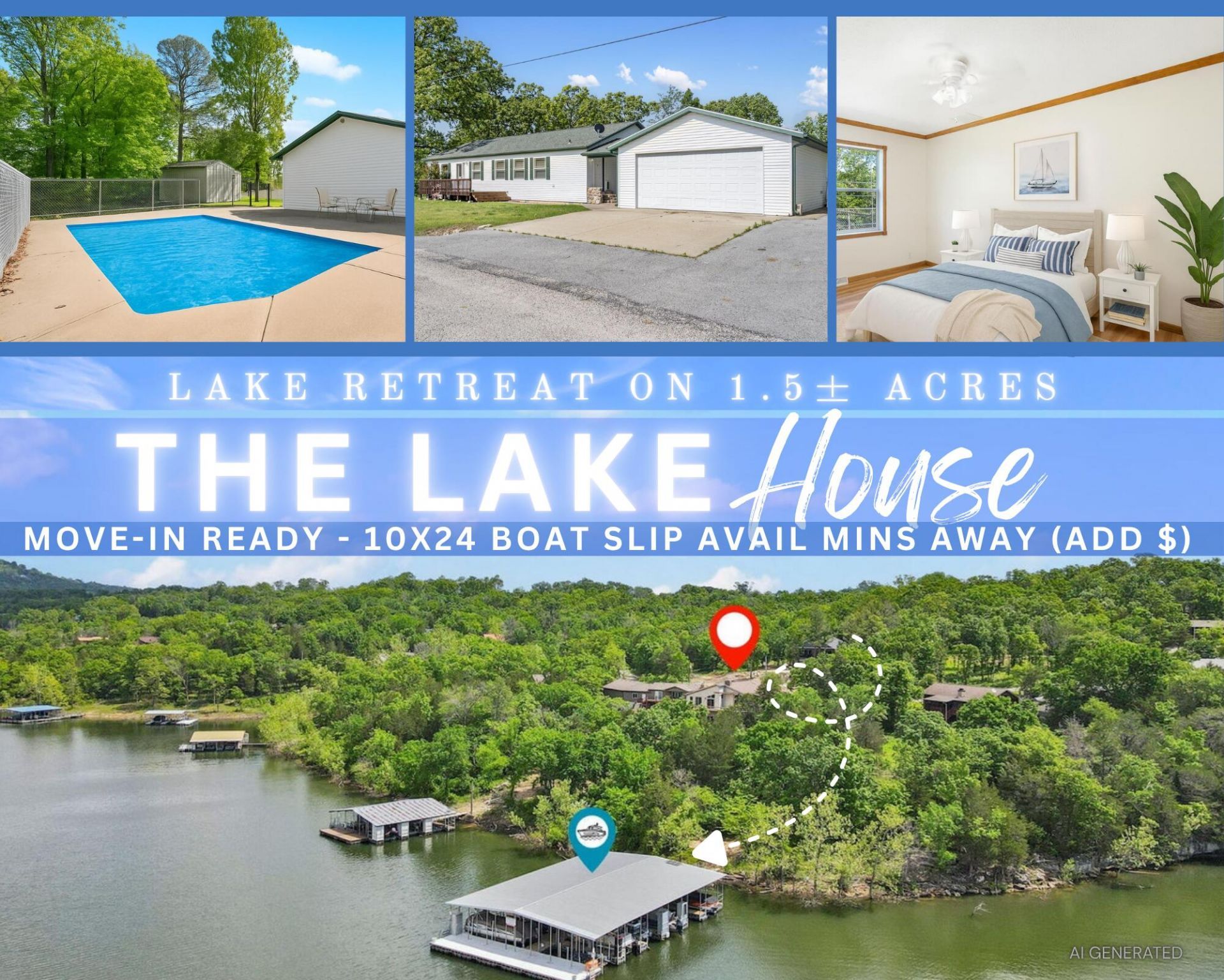 Lake-Close Retreat w/Pool + 1.5± Acres | Boat Slip Available | Shell Knob, MOReady for an easy, summer-ready lifestyle near Table Rock Lake? Welcome to 23111 Kings Ln--a rare blend of space, functionality & lake convenience, all set on 1.5± peaceful acres in the heart of Shell Knob.This well-maintained, one-level home offers 3 bedrooms, 2 baths & a bright, open layout designed for everyday comfort & gathering. Natural light pours in through oversized windows, while the spacious kitchen delivers w/ample cabinetry, walk-in pantry & room to host everything from weekend guests to holiday meals.Step outside & the lifestyle really opens up--your private in-ground pool creates the perfect backyard escape, surrounded by mature hardwoods & a park-like setting ideal for relaxing, entertaining, gardening or simply enjoying the quiet Ozarks.Need space for lake toys, hobbies or a workshop? You'll love the two detached garages (one connected by breezeway), plus generous parking & room to grow.And the lake life bonus: optional 10x24 boat slip (add $65K) just a short golf cart ride away--making lake days quick, easy & part of your everyday routine.The owner's suite offers a comfortable retreat w/dual vanities, soaking tub/shower combo & an oversized walk-in closet, while two additional bedrooms provide flexibility for guests, family or office space.Located minutes to Shell Knob amenities including Harter House, restaurants, marinas & more--this property offers the perfect balance of privacy, convenience & lake access.Acreage. Pool. Lake access. Space to live, gather & enjoy--without the luxury price tag.