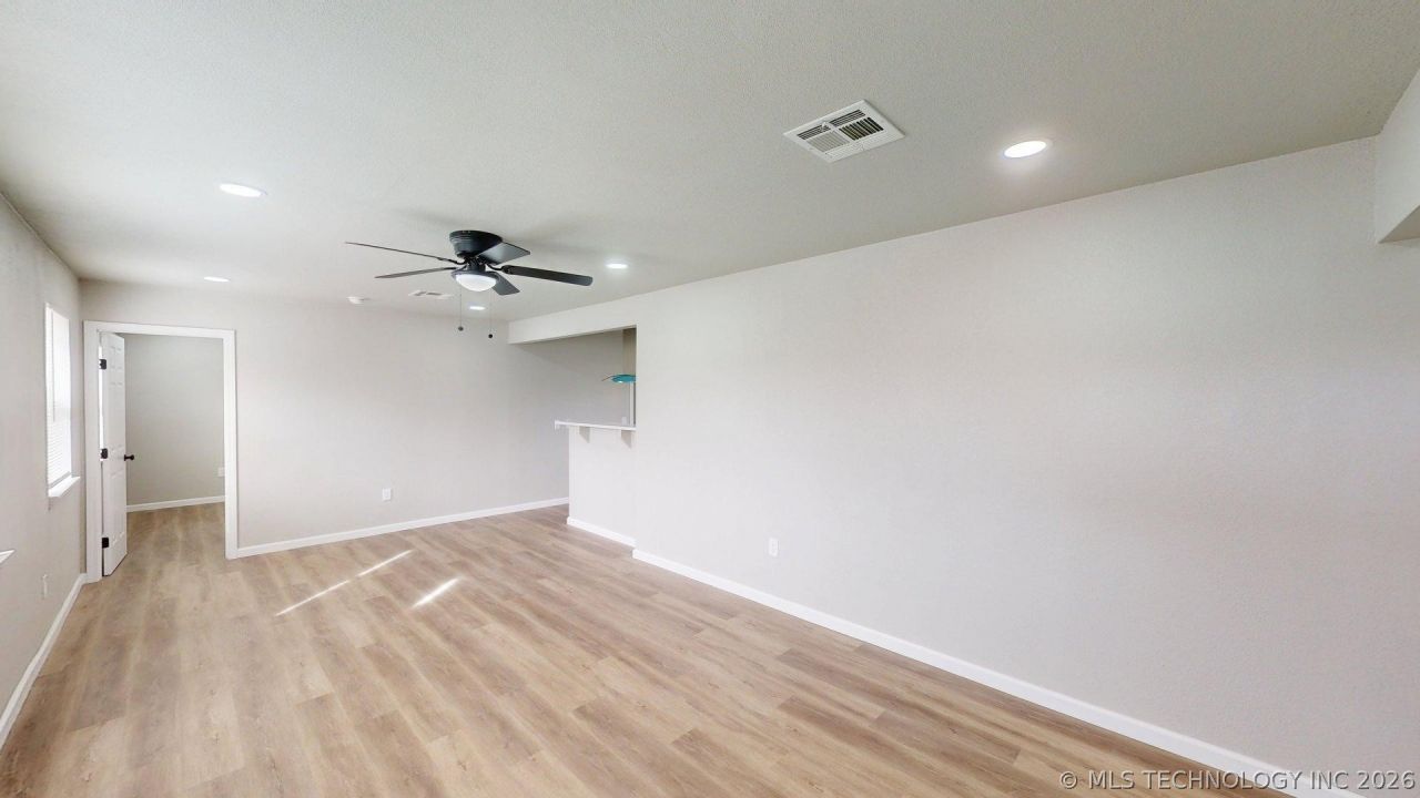 Four bedroom split plan with 2 new bathrooms. Kitchen updates include tiled backsplash, new dishwasher, new vent hood, new quartz counter tops, new kitchen cabinets and new garbage disposal, new sink. Both bathrooms have new vanities, new toilets, new sinks, new fixtures, new lights and new tiled walls & floors. Whole house improvements include new paint, new doors, new vinyl plank flooring, new blinds. New roof 11/16/2025. Newer vinyl windows. Newer hvac system. Backyard fully fenced with chain link. New cover added to front porch. New gas line and meter installed by gas company. Tulsa Schools.