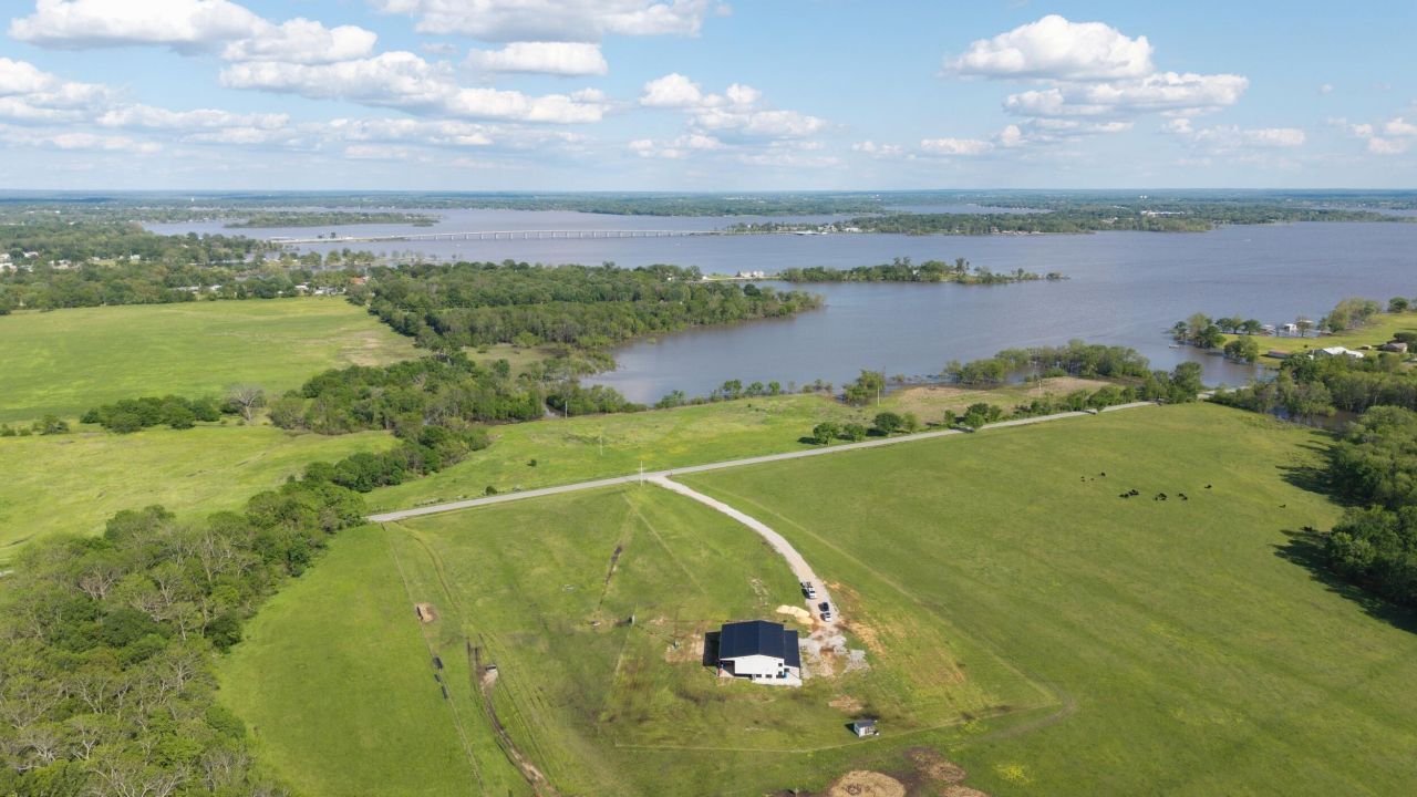 Peaceful 51.33-acre property with Grand Lake and country views. There is a boat ramp at the end of the road for easy lake access. The property features a 40x60 red iron barndominium with a 23' peak ceiling, spray foam insulation, 5-ton A/C, and a 6'' 4,000 PSI concrete slab, (2) 12x14 insulated automatic doors, four walk-in doors, and tinted vinyl windows that provide great natural light. It includes hookups for a gas stove, washer/dryer, and tankless hot water heater with plumbing roughed in and conduit under the slab. The property is fully fenced and has electric fencing in key areas. Outdoor features include: chicken coop, a covered wraparound patio, outdoor kitchen hookups, a small front porch with a 12x60 lean-to. It's completely ready to build, with water, electric (800 amp), gas, and plumbing already in place. A 600 aerobic septic system that supports both a future home and the barndo, and there are two 50 amp RV hookups. This is a rare setup offering privacy, space, and flexibility. Settle into the barndo while you build your dream home!