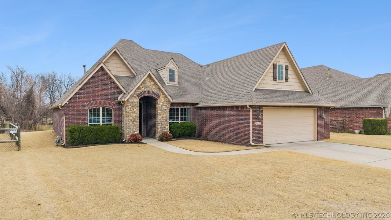 Beautiful brick home backing to greenbelt with views of the 3rd hole of Broken Arrow Golf & Athletic Club! This well maintained 4 bedroom, 3 bath home offers an excellent layout with two bedrooms downstairs, 2.5 car garage, formal dining room, private office, and a large upstairs game/theatre room. The open kitchen and living area is filled with natural light and features hardwood floors, fireplace, butler's pantry, and large pantry. The spacious primary suite features double sinks, soaking tub, separate tiled shower, and large walk-in closet with direct access to the laundry room. Upstairs you'll find two additional bedrooms, a full bath, and a large flex space theatre/gameroom. The covered patio with gas fireplace overlooks the greenbelt and golf course, creating a great space to relax or entertain.Additional upgrades include surround sound in the primary bedroom, office, living room, patio, and theatre room, whole-home surge protector, in-home humidifier, and full gutters.