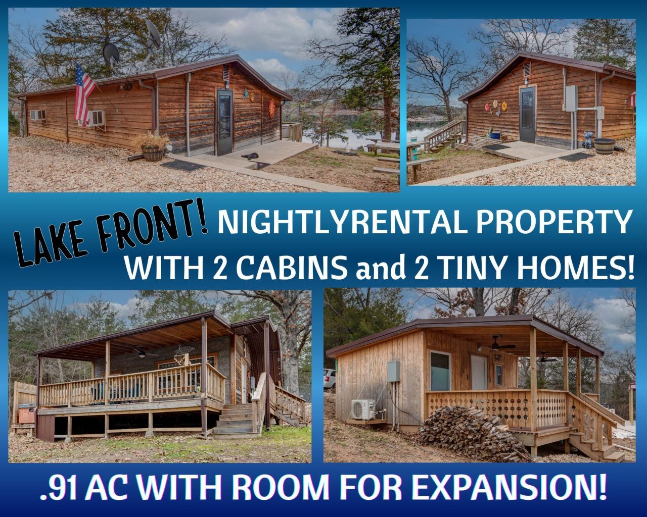 🌅 Golden Opportunity on Table Rock Lake! 🌅Welcome to a one-of-a-kind lakefront property in Golden, MO, where opportunity and lifestyle meet on the shores of Table Rock Lake. This remarkable retreat features two charming lake front cabins and two tiny homes, all currently operating as a thriving nightly rental business that draws guests back year after year to enjoy this charming setting nestled on the shores of Table Rock lake.Each cabin is designed for comfort, sleeping up to nine guests with two full baths. The newest tiny home is a true showpiece, offering sleeping space for five with a full bath, while the second tiny home provides a cozy efficiency layout with a sofa bed for two where you can still enjoy a great lake view. Each cabin and tiny home offer large decks to enjoy outdoor living. The lake front units all include hot tubs to enjoy while relaxing and breathing in the peace and tranquility of this perfect spot. Beyond the living spaces, the property includes a nice size storage building, with the option to add a large storage container for additional storage space. Seller has available a pontoon boat so your guests can cruise the lake at their leisure, and for those looking to expand accommodations even further, the seller's RV would make a great addition. Both pontoon and RV are available for purchase.Whether you choose to continue the successful rental business, expand with more units, or clear the property to build your lakefront dream home, the possibilities here are endless. This is truly a rare chance to own a piece of paradise in Golden, MO?an investment, a lifestyle, and a dream... all rolled into one.