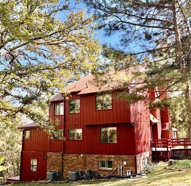 Situated on 50 peaceful acres in the foothills of the Ozarks, this unique three-story contemporary home was designed by two University of Arkansas architecture students, inspired by E. Fay Jones, an apprentice of Frank Lloyd Wright. With an open floor plan, this charming home boasts a custom kitchen with quartz countertops, a skylight, copper backsplash, center island with a wet bar, stainless steel appliances, and handmade beveled glass cabinets. The main house features 3 bedrooms, 2 baths, a high efficiency woodburning fireplace, and a custom-built sunroom. The property includes a spacious garage with workspace and a 30x50 barn with penned areas for animals. Nature lovers will enjoy 10 acres of pasture, 40 wooded acres, a 3-season stream, and hiking/ATV trails. Hunting opportunities abound, especially for deer. This property offers a setting for anyone who values privacy, nature, and a variety of outdoor activities with serene country living and easy access to the vibrant culture of Northwest Arkansas.