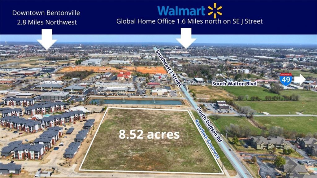 Land for sale strategically positioned on the Rogers/Bentonville border along South Dodson Road near I-49. This +/- 8.52-acre development opportunity presents a rare chance to deliver a high-quality residential and mixed-use community ? featuring apartments, townhomes, multi-unit homes, and ground-floor commercial ? within one of Northwest Arkansas' most rapidly growing and lifestyle-driven corridors, steps from the Razorback Regional Greenway, minutes from Walmart's global home office, and adjacent to the prestigious Pinnacle Hills district.