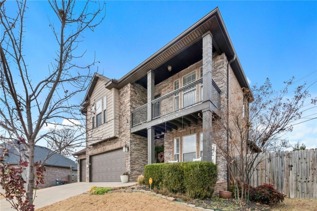 Built in 2016, this 4-bedroom, 2.5-bath residence spans 2,240 square feet on an oversized cul-de-sac lot in Cave Springs. Quality-built home with brick and stone exterior, a rare 3-car garage, and thoughtful design throughout. The open concept main level flows from kitchen to living and dining, anchored by rich hardwoods, crown molding, and a tile-surround gas fireplace. The kitchen features granite counters, a large island, stainless appliances with gas range, walk-in pantry, and tiled backsplash. A covered front porch, covered rear patio, and second-story balcony invite you to enjoy NWA's seasons in comfort. The location is exceptional: minutes to I-49 and Highway 112, a short drive to Pinnacle Hills Promenade, XNA, Mt. Hebron, and the full breadth of Bentonville and Rogers dining, shopping, and entertainment. The community offers a pool and playground. A well-appointed home in a setting that makes Northwest Arkansas living effortless.