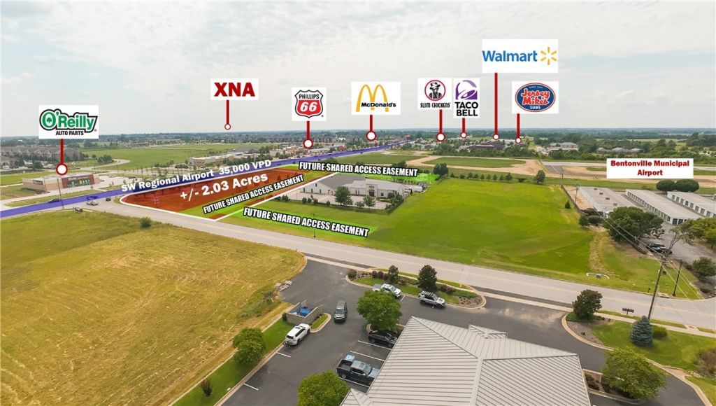 This prime +/- 2.03 acre commercial lot offers an unbeatable location with SW Regional Airport Blvd frontage, which approx. 35,000 VPD. Zoned C-2 General Commercial, it's ideal for retail space, restaurants, medical offices, professional offices, auto repair shops, car washes, and more. The site is open, level, and development ready with electric and water available on site and sewer access at the street. Positioned next to the Bentonville Municipal Airport, the property is only 2 miles from I-49, 3 miles from Walmart's new World HQ, 3.1 miles from Downtown Bentonville, and 10 miles from Northwest Arkansas National Airport (XNA). With exceptional visibility, strong traffic counts, and utilities already in place, this lot is an outstanding opportunity for investors and business owners seeking high exposure commercial real estate in one of the fastest growing markets in NWA! Parcel is subject to lot split approval from City of Bentonville. Future shared access agreement to be created and recorded at closing.