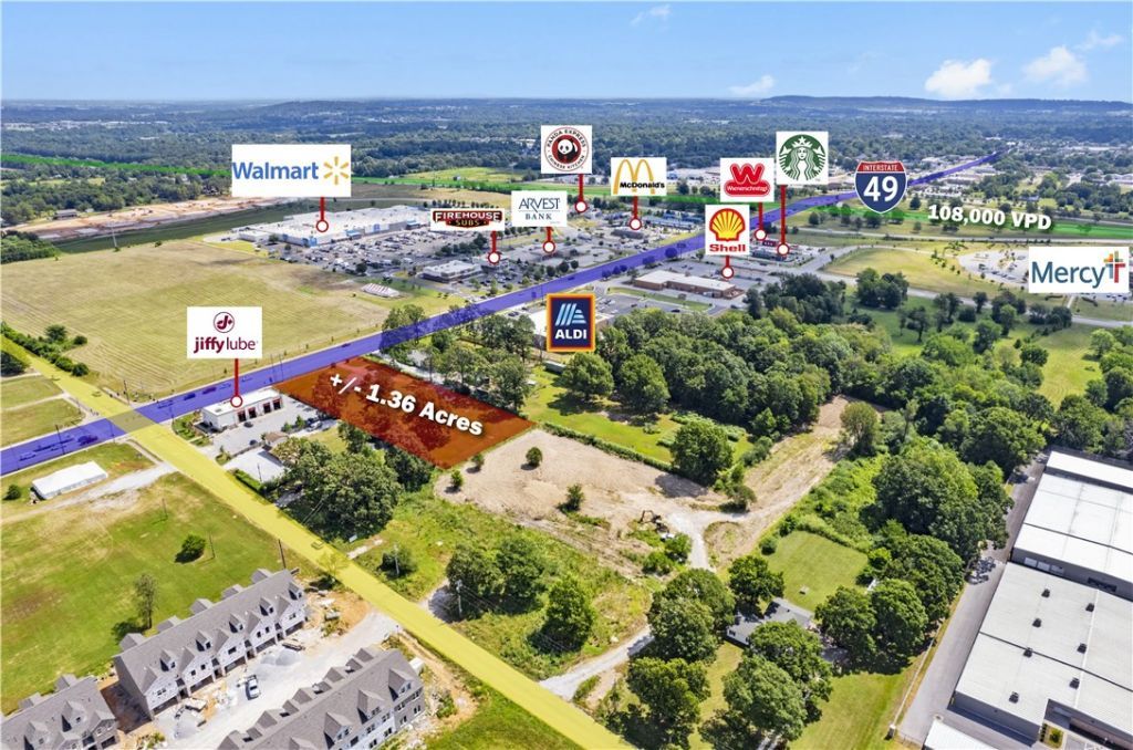 Prime re-development opportunity on +/- 1.36 acres of level land right off Elm Springs Rd, which sees around 17,000 VPD! This piece of land is strategically located near one of the busiest Walmart Supercenters, considered a Test Store and just a half mile from I-49, which sees around 108,000 VPD/ Surrounded by excellent neighboring businesses including Aldi, Arvest Bank, Jiffy Lube, Firehouse Subs, Starbucks, Shell Gas Station and more. These businesses help provide a solid local demographic and potential customer base. Sewer is available on the site next door. Currently Zoned C-5 Thoroughfare Commercial, allowing for endless development potential, including, office/retail buildings, medical facilities, hotel, and more! Don't miss out on this ideal site for your next project!