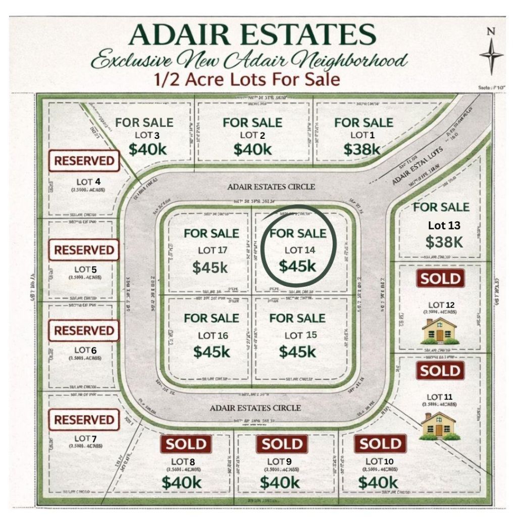 LOT #14. Discover your perfect homesite in the newly developed Adair Estates, a limited community featuring just 17 exclusive half-acre lots. NO HOA! With utility infrastructure already in place, water and electricity are readily available, making it easy to start building your dream home. Enjoy the tranquility and space of a rural setting while being part of a thoughtfully planned neighborhood. Don't miss this rare opportunity to secure your spot in Adair Estates. State will be paving road.