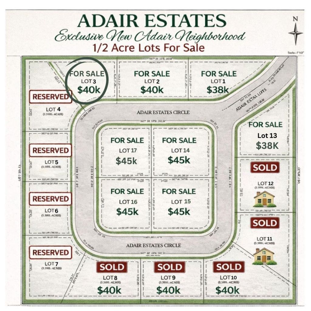 LOT #3. Discover your perfect homesite in the newly developed Adair Estates, a limited community featuring just 17 exclusive half-acre lots. NO HOA! With utility infrastructure already in place, water and electricity are readily available, making it easy to start building your dream home. Enjoy the tranquility and space of a rural setting while being part of a thoughtfully planned neighborhood. Don't miss this rare opportunity to secure your spot in Adair Estates. State will be paving road.