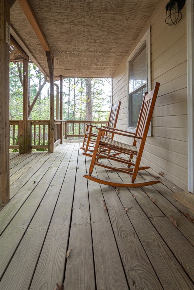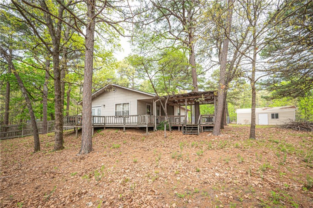 Single-level 3-bedroom, 2-bath home on 5 acres in the Grand Lake area with a wraparound deck, covered porch, and fenced yard. The layout offers practical everyday living, while the vaulted living area creates an open feel. Wood laminate flooring, blinds, and ceiling fans add comfort and function throughout the home. Approx. 2 open acres and 3 wooded acres provide room for gardening, outdoor projects, pets, or simply enjoying the peaceful rural setting. Mature trees and a distant view of Grand Lake add to the atmosphere, while the gravel drive and detached metal building add flexibility for storage, hobbies, or workspace. Covered porch and deck space provide multiple spots to relax, gather, or take in the setting, with room to spread and enjoy the outdoors. Located about 1.2 miles from Stony Point Resort, 2 miles from Serenity Point, 10.8 miles from America's Outdoor Adventure Park, and about 15 miles from Walmart, this property offers a country setting with access to lake-area recreation and everyday conveniences.