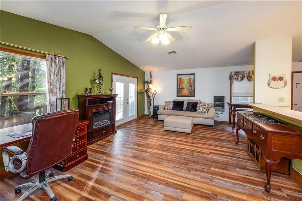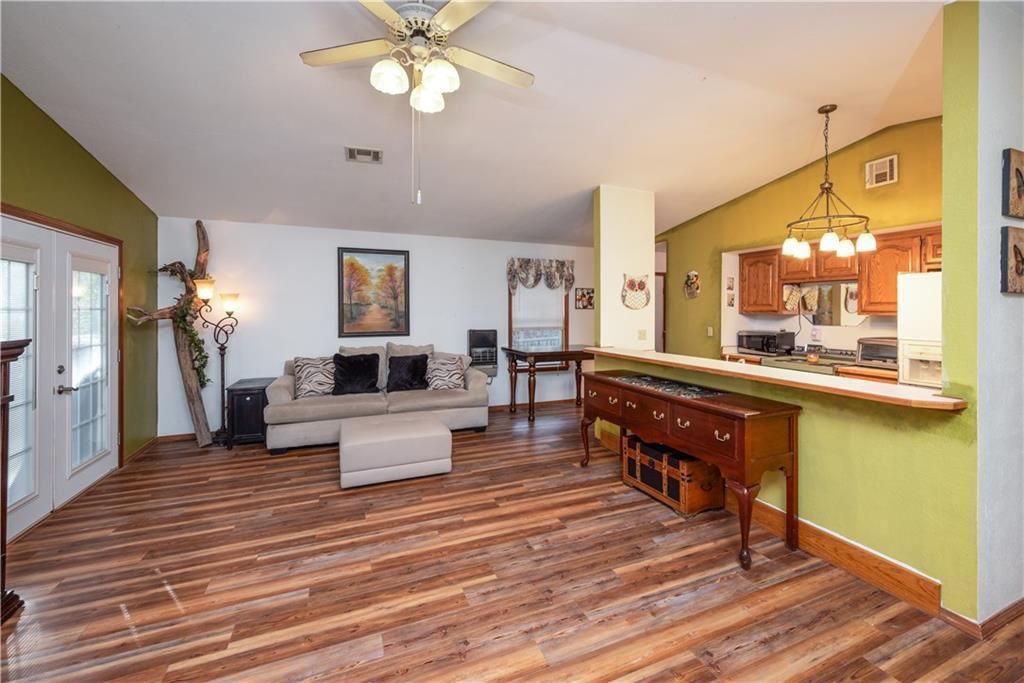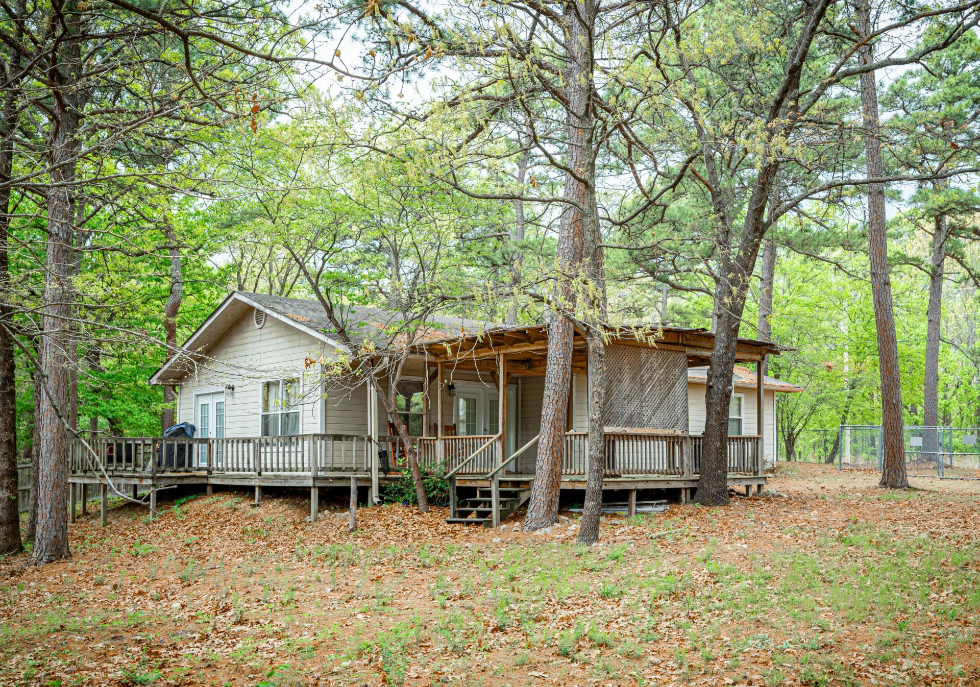 Single-level 3-bedroom, 2-bath home on 5 acres in the Grand Lake area with a wraparound deck, covered porch, and fenced yard. The vaulted living area creates an open feel, while wood laminate flooring, blinds, and ceiling fans add everyday comfort and function. Approx. 2 open acres and 3 wooded acres provide room for gardening, outdoor projects, pets, or simply enjoying the peaceful rural setting. Mature trees and a distant view of Grand Lake add to the appeal. Gravel drive and detached metal building offer added flexibility for storage, hobbies, or workspace. Located about 1.2 miles from Stony Point Resort, 2 miles from Serenity Point, 10.8 miles from America's Outdoor Adventure Park, and about 15 miles from Walmart.