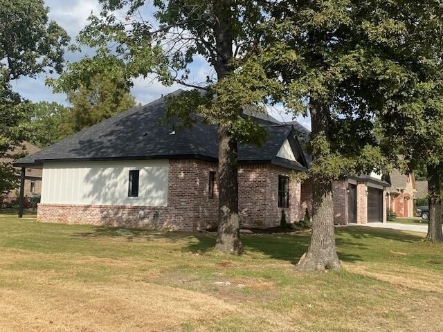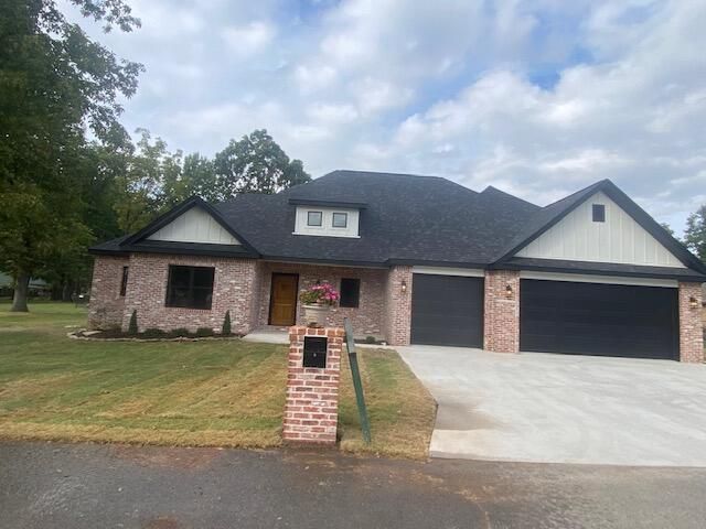Beautiful Brand New Langley Quality Home in great area 9 min to town! Walk to local Patricia Island Country Club and boat ramp within walking distance as well. Boat slip rental available now. appx 300 ft. away. This Beautiful french country farmhouse is custom built with all the details you would expect in a Langley Home like the nice size walk-in secret pantry with 2nd fridge and lots of storage. Your Chef will love the 6 burner gas stove and quality appliances .The kitchen has a huge island and open concept to living with beams and fireplace. Large covered back porch overlooking the neighbors beautiful gardens. u Wonderful laundry adjoins the primary closet with built-ins, drawers, cubbies and safe! Master bath offers Nice zero entrance walk-in shower with seat as well as gorgeous spa like soaker tub. All flooring plank or tile no carpet. Great split plan with guest on one side, owner suite on other. 3rd BR could be office, offers a sliding barn door & large closet. Here's some of the upgrades you might not know: Lennox high effeciency Gas heat and a/c, Brick is a used brick (more expensive) Custom locking mailbox, black window trims, custom guttering, beautiful and plentiful lighting and cabinet jewelry, custom cabinets and trim as well as crown molding, low E glass on windows, Deep enough garage for long truck, High Wind resistant shingles. This is on city sewer and city limits. No HOA or dues. You can elect to join the country club down the street which has 18 hole golf, pool, pickle ball, fitness center and wonderful restaurant and you can choose to rent a slip20' x 30' if available for your boat. Other than that no mandatory fees, but covenants to protect your investment. No VRBO in the area. Owner is an agent in Ok.