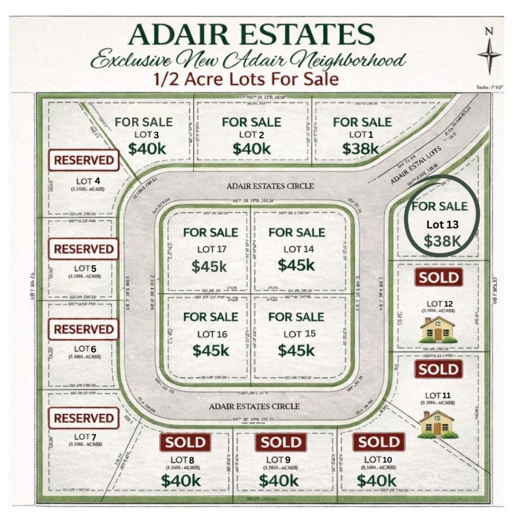 LOT #13. Discover your perfect homesite in the newly developed Adair Estates, a limited community featuring just 17 exclusive half-acre lots. NO HOA! With utility infrastructure already in place, water and electricity are readily available, making it easy to start building your dream home. Enjoy the tranquility and space of a rural setting while being part of a thoughtfully planned neighborhood. Don't miss this rare opportunity to secure your spot in Adair Estates. State will be paving road.