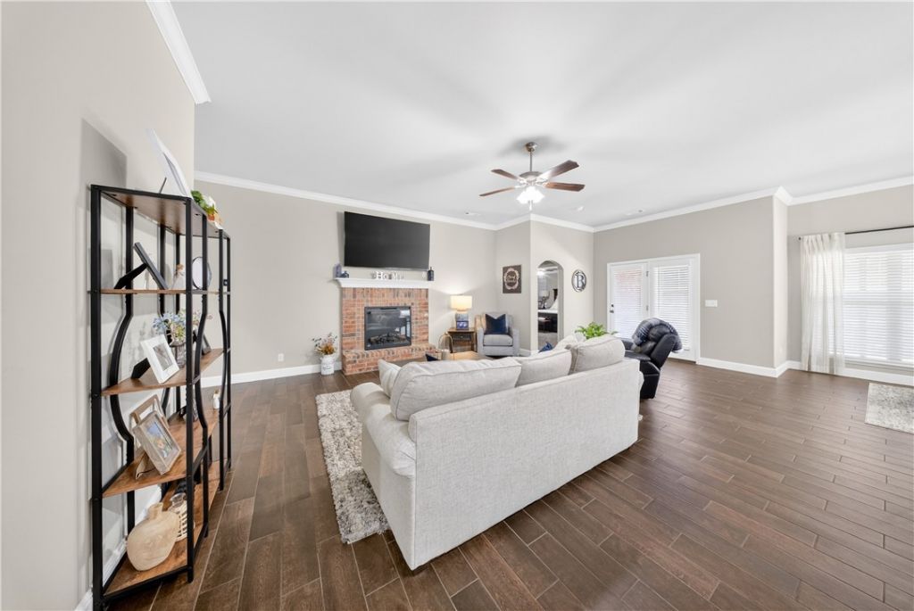 This energy efficient home sits on a desirable corner lot and offers room to live, gather, and grow. From the moment you walk in, you'll appreciate the expansive, open living area centered around a cozy brick fireplace?perfect for hosting or relaxing. You'll love the abundant cabinetry in the kitchen, generous storage, & large island ?ideal for everyday living or entertaining. Granite countertops run throughout, and the dining area easily accommodates a large table, making it perfect for gatherings. The spacious primary suite is a true retreat, featuring a boxed ceiling and a well-appointed bath with dual split vanities, a soaking tub, custom tile shower with seating, and a large walk-in closet. The smart split floor plan offers two secondary bedrooms and a full bath at the front of the home, while a private 4th bedroom and third full bath are tucked away?perfect for guests, a home office, or multigenerational living. Step outside to enjoy the oversized, partially covered patio and fully fenced backyard.