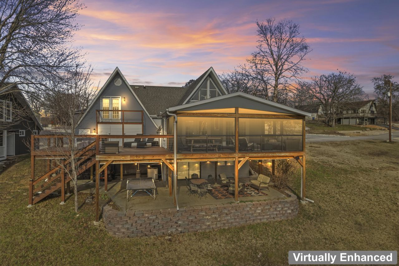 Enjoy stunning Table Rock Lake views from this beautiful, 4 bedroom, 4 bath lakefront home in Lampe, MO. Fully immerse yourself in the lake lifestyle, just steps from the shoreline and the optionally available boat slip. Enjoy an open concept kitchen/living area with vaulted ceilings and natural wood beams, drenched in natural light! Offers a spacious screened-in patio along with abundant deck space. The massive deck and screened-in-patio with composite decking were added in 2023. This thoughtfully furnished home boasts 4 private bedroom, each with an ensuite bathroom as well as a hall bathroom for the convenience of guests. Step out onto the enclosed patio, spacious enough for additional dining and relaxing. The walk-out basement provides ample space for entertainment, including a huge living space, wet bar, and separate patio for ping pong, corn hole, and other recreation. Designed for easy lake living, this home offers low maintenance and energy efficient features that help ownership simple and comfortable year round.