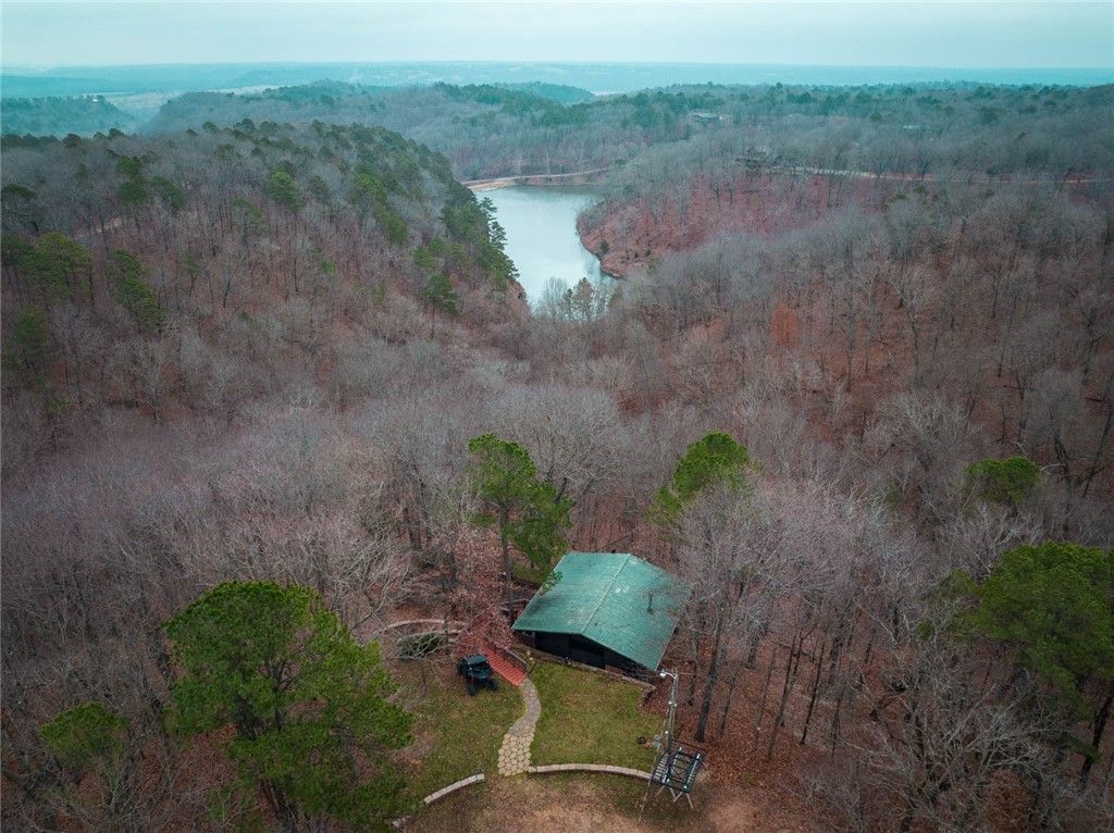 Enjoy ultimate privacy on Eagle View Circle in a super cool tree-top bunker cabin overlooking Clear Lake, right in the heart of the Flint Ridge gated community. This two-level retreat offers peace, quiet, and warmth, with the living room, kitchen, and half bath upstairs, and the bedroom downstairs. The primary bedroom features a walk-in closet that doubles as a safe room, plus a full bath and utility room; there's also a second bedroom, bunk room, or cozy den option. Outdoor living includes an upper deck with automatic patio shades and a lower screened porch leading to an enclosed yard with a storage building. Fully furnished and ready to enjoy, this cabin is part of a 7,000-acre gated community on the Illinois River, where ATVs are a common of travel. Amenities include fishing, kayaking, a restaurant & clubhouse, a 9-hole golf course, tennis courts, mini-golf, & pools for summer fun. Airbnb rentals welcome here. Conveniently located between NW Arkansas and Tulsa, OK, with easy access from the Cherokee Turnpike.