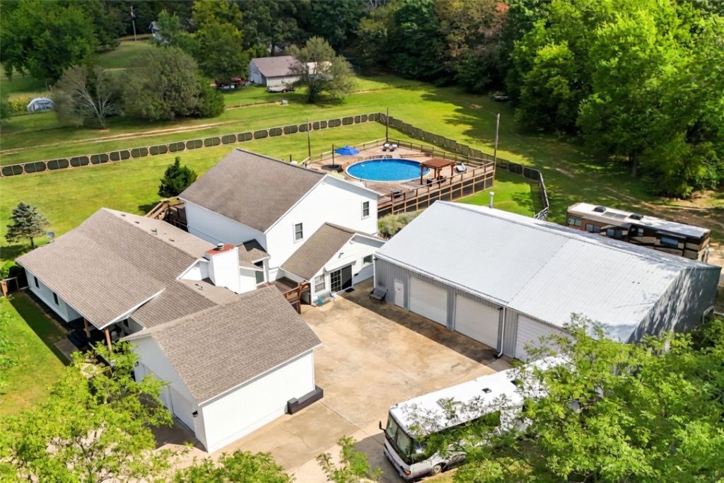 LIMITLESS OPTIONS FOR FAMILY, INVESTORS, AT HOME BIZ OR EVENTS AND 6 MINS TO THE UNIVERISTY OF ARKANSAS! This pristine land & unique tri-level home offers a heated pool & hot tub, sustainable green living w/ a geothermal HVAC system, all new Low-E windows, exterior security sys., brand-new roof and all newly updated appliances + multiple living spaces, 2 kitchens & laundry on each floor. Upper level has living area w/ dual-oven kitchen, 3 bed & 2 bath. Mid level has 3 bed, 3 bath, kitchenette + direct access to deck & pool. Lower level is ideal for entertaining or multi-gen living w/ tall ceilings, kitchen, theater, laundry & bath. Outdoor oasis w/ pool, wrap-around deck & hot tub. Perfect for relaxation & gatherings, the impressive theater room is perfect for game days & movie nights. This isn't just a home, it's an opportunity. A 2,400 sq. ft., 3-Bay, climate-controlled shop is a dream for a biz owner, car-enthusiast or artist w/ 10 ton car lift, compressed air plumbing, welding setup, 1/2 bath + pickleball court