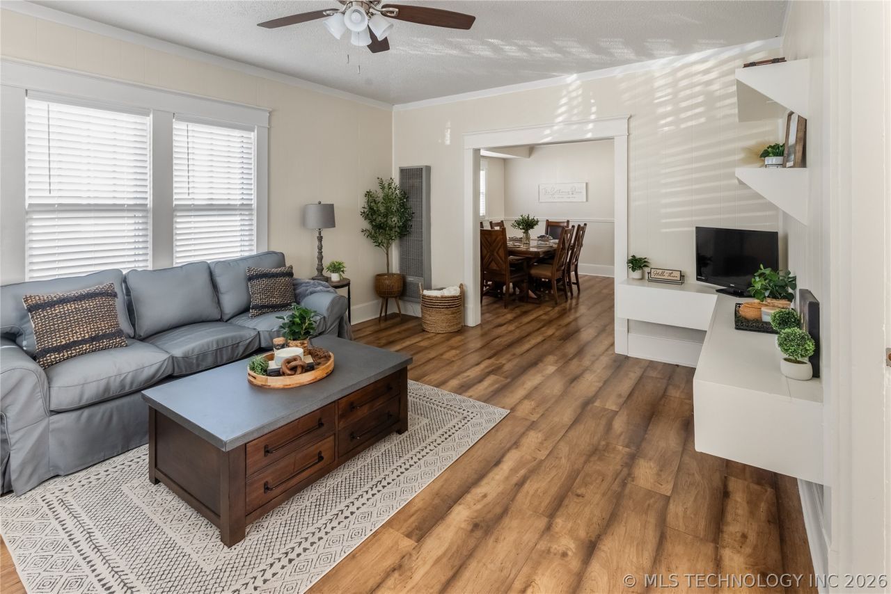 Welcome to this refreshed 3-bedroom, 2-bath home offering thoughtful updates, great functionality, and timeless charm throughout. From the covered front porch to the warm interior finishes, this home is truly move-in ready. Inside, you'll find fresh interior paint, new lighting, new ceiling fans, brand-new blinds, and updated electrical outlets that help give the home a clean, refreshed feel. The spacious living room offers wonderful natural light and flows nicely into a separate formal dining room. The kitchen features new vinyl flooring, freshly painted cabinets with new hardware, ample counter space, and enough room for a breakfast table. You'll enjoy having both an eat-in kitchen option and a dedicated dining room. Both bathrooms include new toilets, and one has a brand-new vanity for a clean, updated look. Outside, enjoy a fenced backyard - ideal for pets or children - along with a 1-car detached garage for parking or extra storage. The covered front porch adds even more charm and a perfect place to relax. This home combines space, updates, and versatility - schedule your showing today!