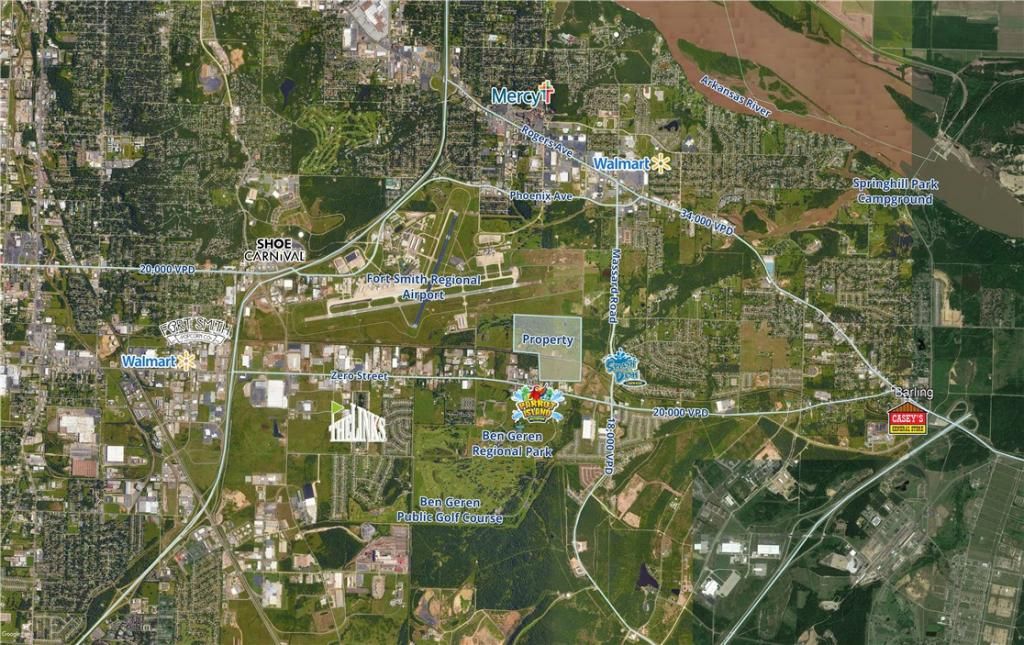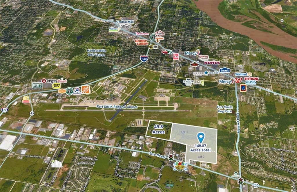 Large tract of land for sale on Zero Street in Fort Smith, Arkansas near the Fort Smith Regional Airport, Interstate 540 and the main business and shopping corridor of the city. Nearby attractions include Parrot Island Waterpark, Ben Geren Regional Park, Arkansas River and Holis Lake campgrounds, along with historic downtown Fort Smith. Total price is dependent on purchase of full property. Lot 1: +/- 113.15 Acres $2,828,750 ($25,000/Acre) Lot 2: +/- 36.72 Acres $2,937,600 ($80,000/Acre)