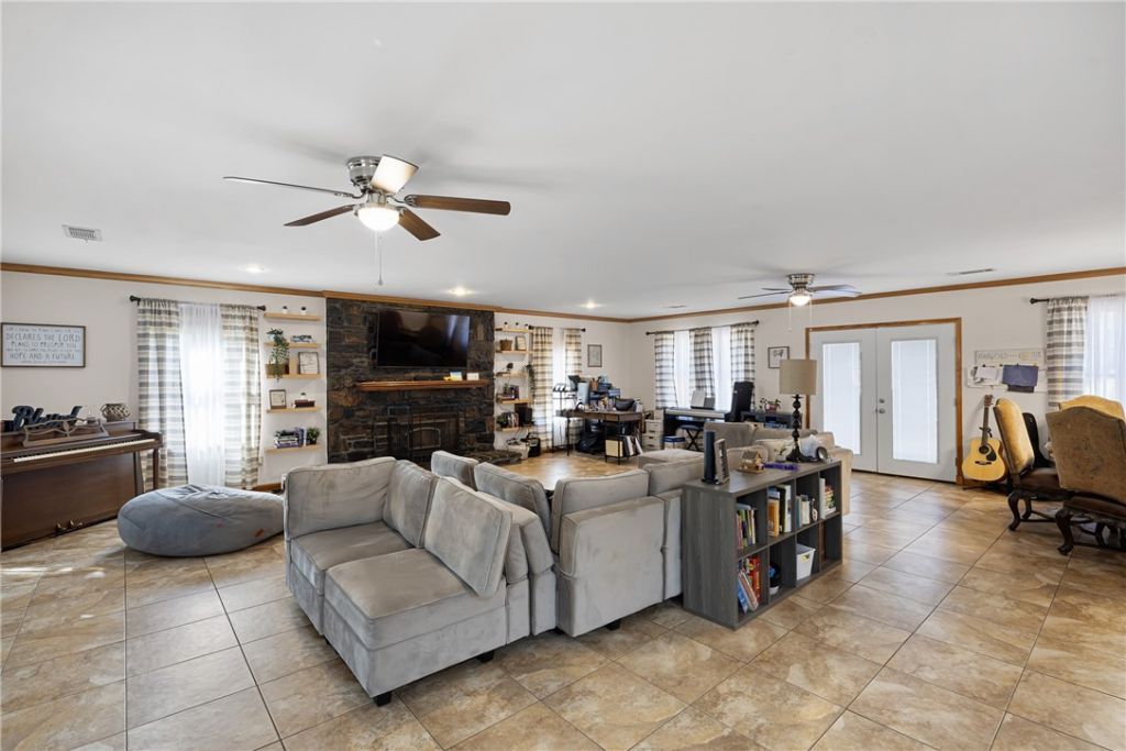 Welcome to your new home! This beautifully maintained property offers nearly 2,500 square feet of comfortable living space, featuring 4 bedrooms and 3 full baths?perfect for those who love to entertain. Step inside and you'll be greeted by an extra-large living area that flows seamlessly into the dining, den and chef's kitchen spaces, creating the ideal setting for gatherings. The spacious primary suite and adjoining bath featuring an extra-large walk-in shower, promises to please. A whole-home generator provides peace of mind year-round, while thoughtful updates throughout make this home move-in ready. Enjoy the outdoors on two inviting patios, one with an outdoor kitchen, perfect for morning coffee or evening relaxation. A custom-built tree house offers exciting playtime adventures, and the storm shelter offers peace of mind. Enjoy the manicured yard that adds charm and curb appeal, offering both beauty and low-maintenance care. Two outdoor storage buildings provide lots of extra storage.