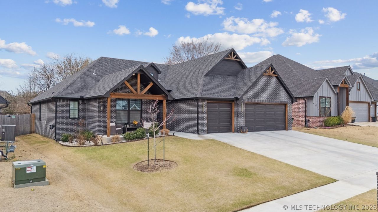 Beautifully upgraded 3-bedroom, 2-bath home offering thoughtfully designed living space filled with character, quality finishes, and modern conveniences. From the moment you enter, you'll notice the hand-scraped maple hardwood floors flowing through the main living areas and the bright open-concept layout that creates a warm and inviting atmosphere. The spacious living room features a striking brick fireplace, built-in surround sound with in-ceiling speakers, and large windows that bring in abundant natural light while creating a seamless flow for everyday living and entertaining. The gourmet kitchen is designed as the heart of the home with a massive 3-inch granite island, custom cabinetry, under-cabinet lighting, built-in refrigerator/freezer, and a hidden 'secret pantry with coffee bar. A nearby bar area includes a wine refrigerator, creating the perfect setup for hosting guests or enjoying a quiet evening at home. The private primary suite offers a relaxing retreat with a spa-like bathroom featuring a soaking tub, a large walk-in full tile shower, and a spacious primary closet with abundant storage. Smart home ready with network and smart switches negotiable. Built-in speakers throughout the living room, patio, and bathrooms will remain with the home. Permanent Govee exterior lighting provides customizable year-round accent and holiday lighting. A dedicated office with a custom built-in desk creates an ideal work-from-home space. Additional upgrades include EV charger access in the three-car garage and thoughtful design details that add unique character throughout the home. Enjoy outdoor living on the covered patio and appreciate the home's beautiful exterior featuring modern brick and timber accents. This home blends comfort, thoughtful upgrades, and timeless design in a desirable Owasso location.